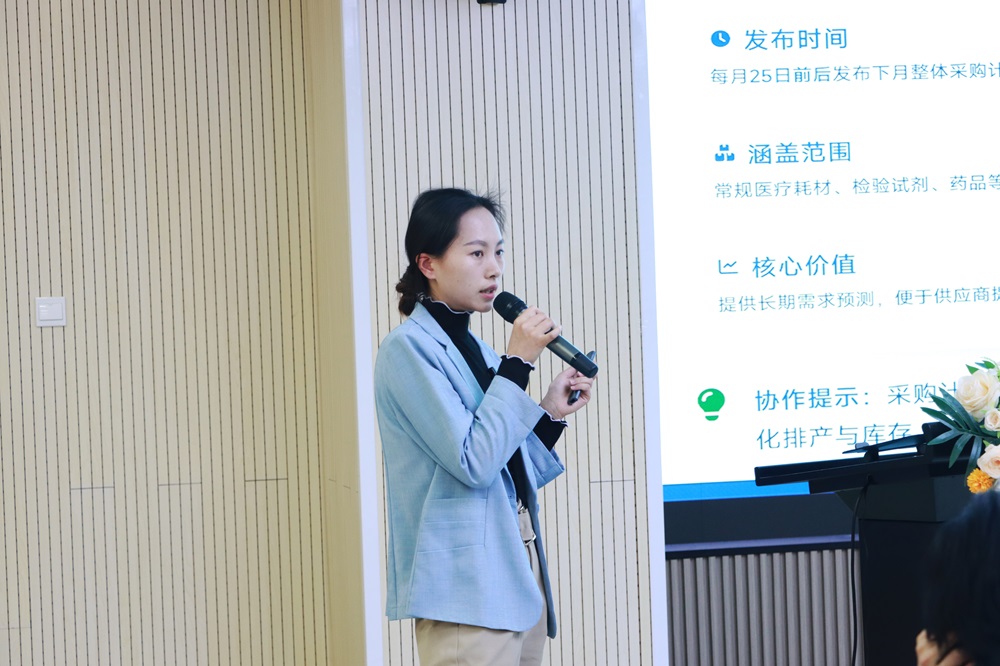 针对采购执行层面的痛点与难点,采购管理部吴玉平围绕“计划制定、下单执行、交付验收、结算回款”四大核心环节进行了专题宣讲。她明确了交付期内准时送货、票据随货同行等标准化操作规范,并针对缺货未报、临期货品处理等常见合作问题提出了具体的改进要求。