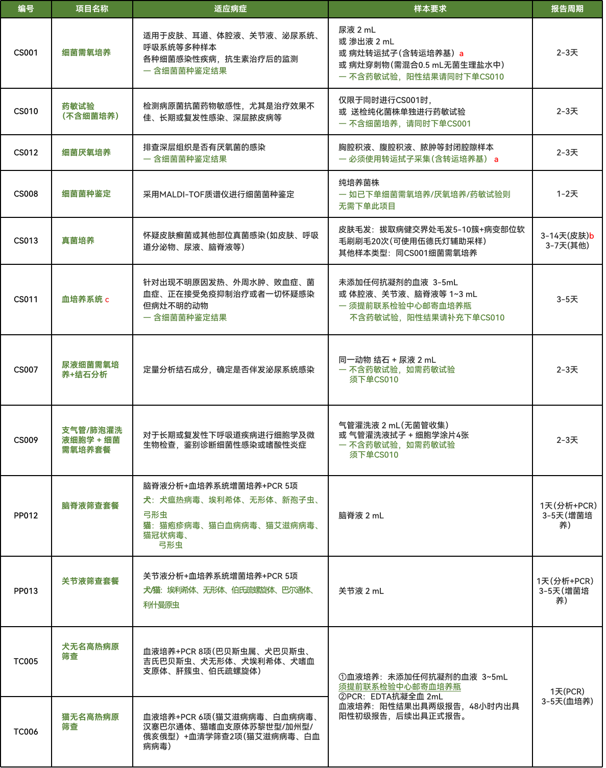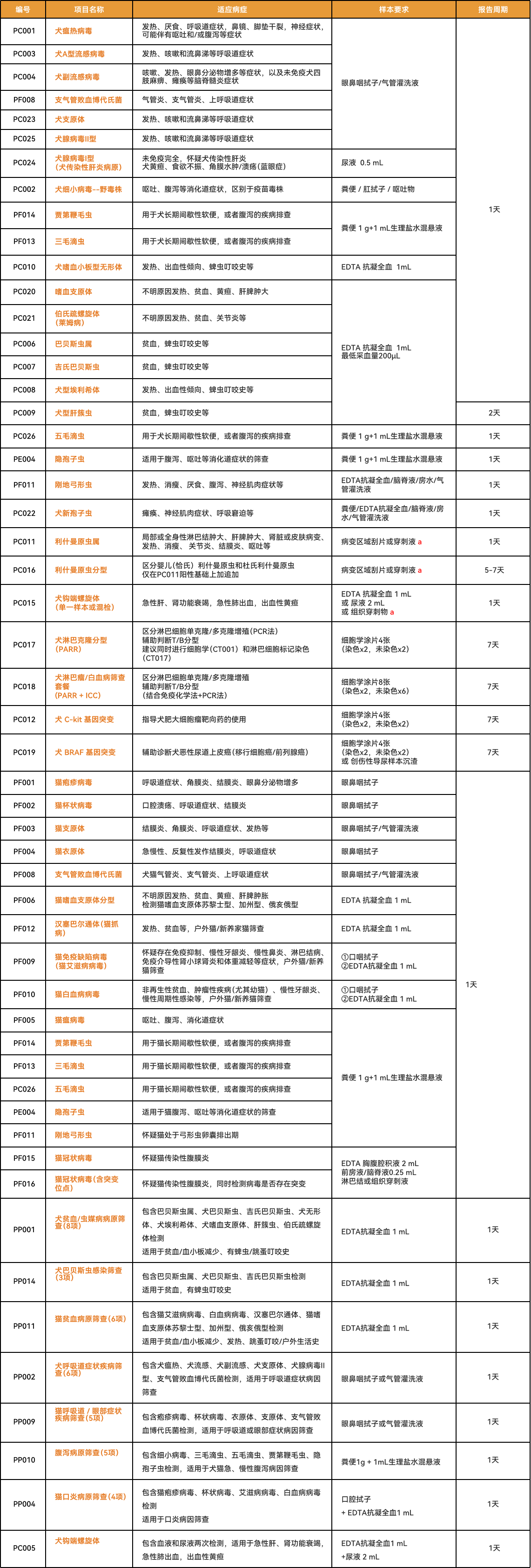 PCR检测项目列表